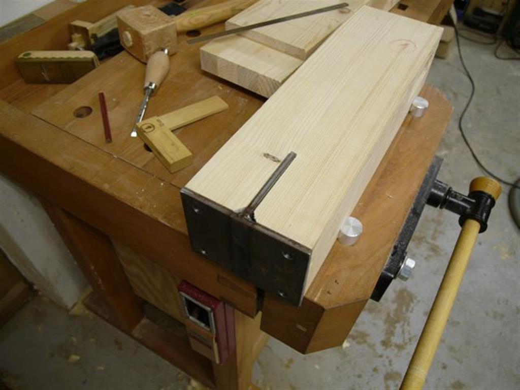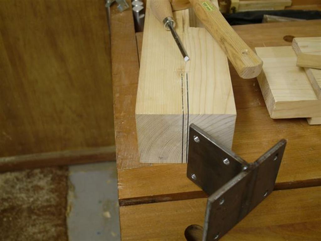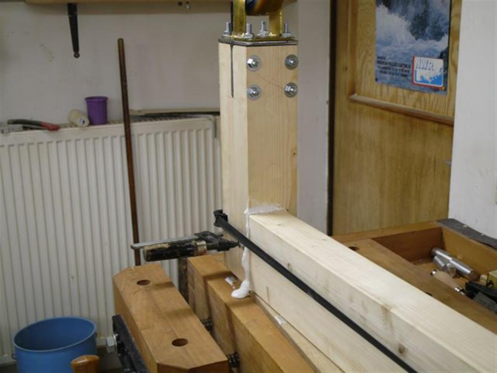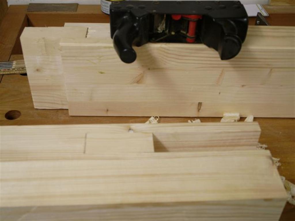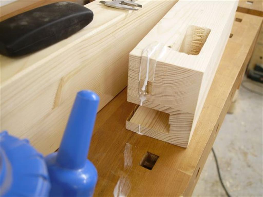 Der senkrechte kurze Fußbalken mit dem Langloch auf der Seite wird mit dem Längsbalken und dessen abgesetztem Zapfen verbunden. Verwendet wird sog. PU-Leim, der beim Aushärten etwas aufschäumt und so die letzte Ritze füllt, zudem ist diese wichtige und tragende Verbindung mit diesem leim „wetterfest“. Auf der Gegenseite des Längsbalkens wird ebenfalls der Fußbalken aufgesetzt und verleimt. So kann die Verbindung einem Bessey-Gurtspanner fest zusammen gezogen werden, zusätzlich werden die Zapfverbindungen seitlich mit je einer kräftigen Schraubzwinge gepresst.