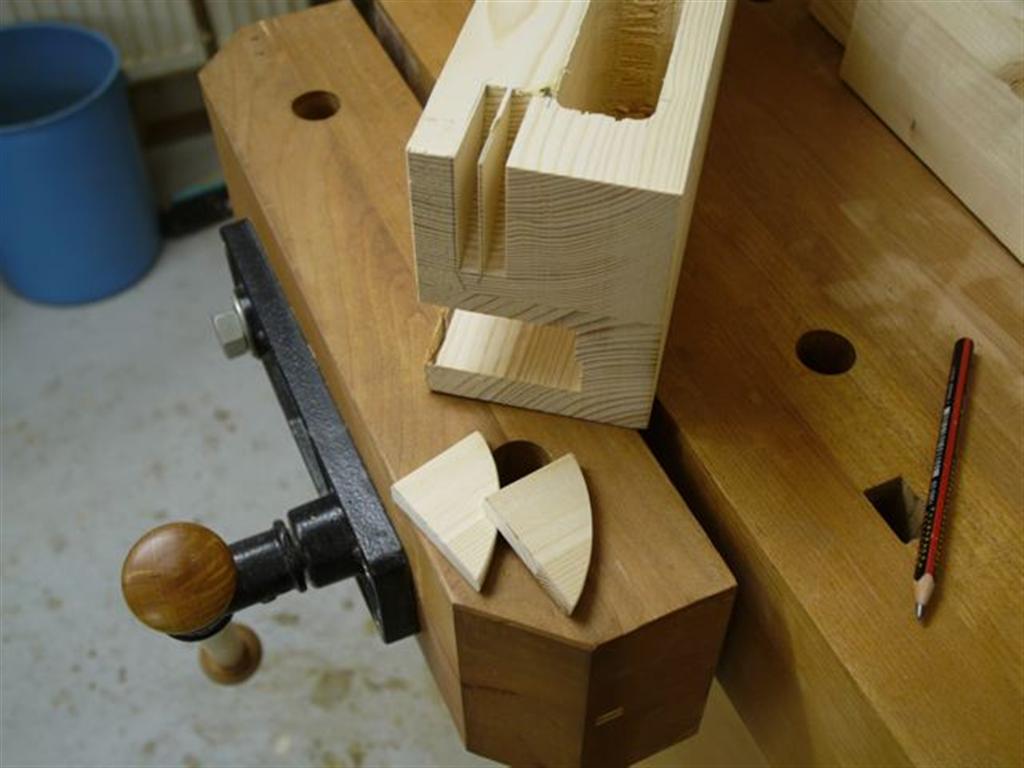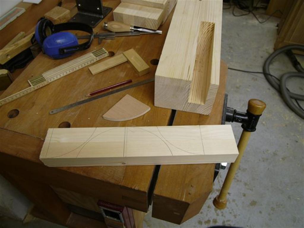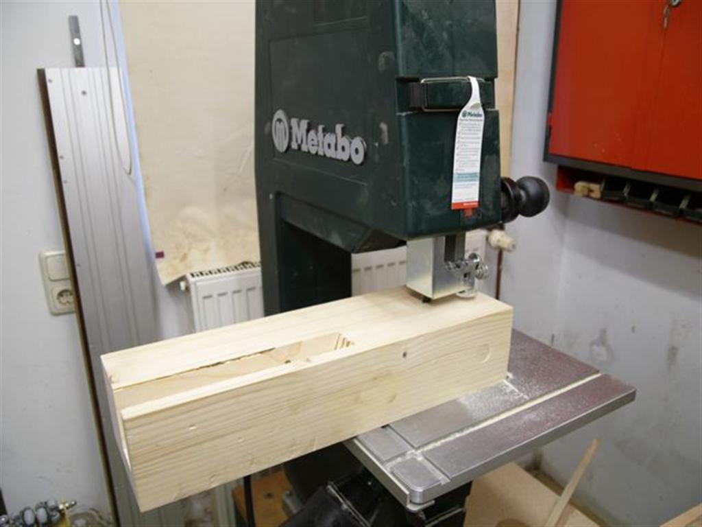 Beim Fräsen entstehen am Ende der Fräsung, sofern dies im Holz endet, eine Rundung, diese hier wurde wegen eines schnellen Arbeitsfortschrittes in Kauf genommen, wird aber nun mit Passstücken egalisiert. Diese Passstücke (Flügel) werden auf der Bandsäge ausgesägt (hier ist auf den Maserverlauf zu achten) und an der Bandschleifmaschine an die Form möglichst genau angepasst. Achtung, kleine Werkstücke am großen Bandschleifer zu schleifen erfordert Übung, packt das Band an der Werkstückvorderkante wird einem das Werkstück aus der Hand gerissen! Langsames Nähern an laufende Band hilft hier.