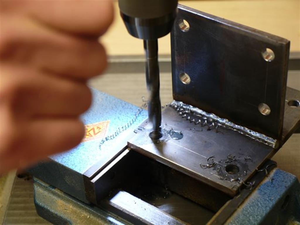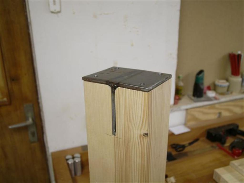 Die 10mm Bohrungen in der Fußplatte werden auf 12mm aufgebohrt, um den Fuß möglichst nah am Holzbalken zu positionieren und so eine möglichst biegesteife Verbindung zu bekommen, werden M10er Schloßschrauben verwendet, deren Vierkantaufnahmen sollen in der 8mm Eisenplatte verschwinden.