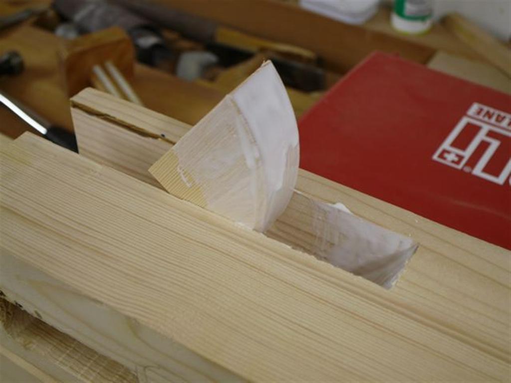 Ein Reparatur-„Flügel“ wird mit Leim in die Fehlstelle gedreht und bis zum Aushärten des Holzleims gepresst.