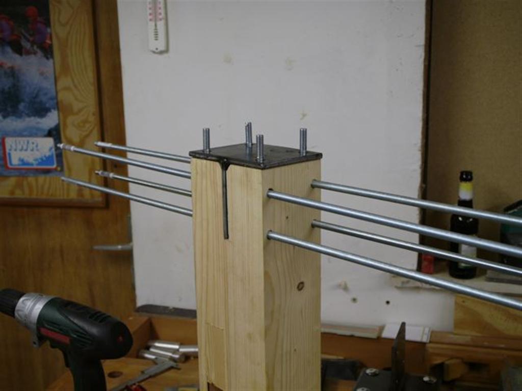 Mit den noch ungekürzten Gewindestangen M10 wird die Position der Bohrungen überprüft, alles passt.