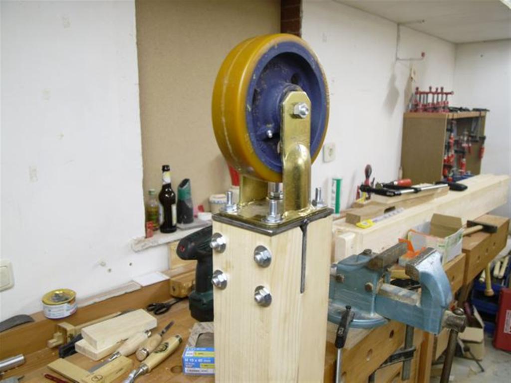 Die 1. Bockrolle wird montiert, hier mit bereits gekürzten Gewindestangen, um den Druck aufs Nadelholz zu reduzieren werden sogenannte Karosseriescheiben, also große Unterlegscheiben beigelegt.
